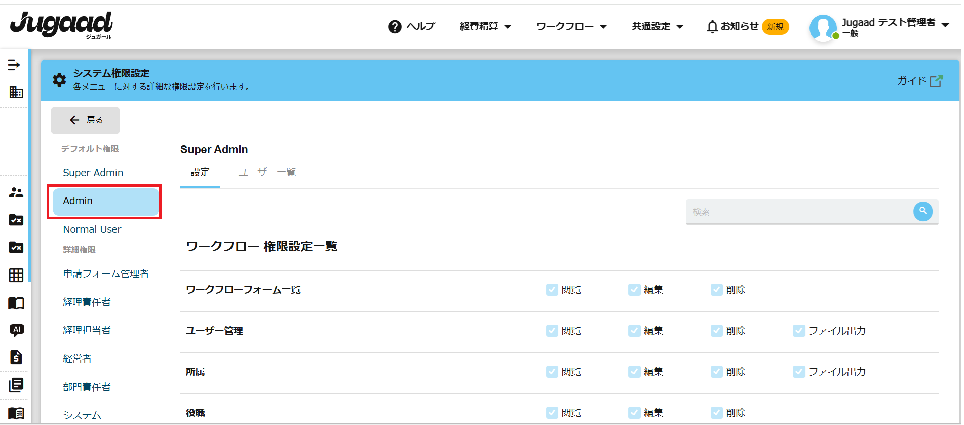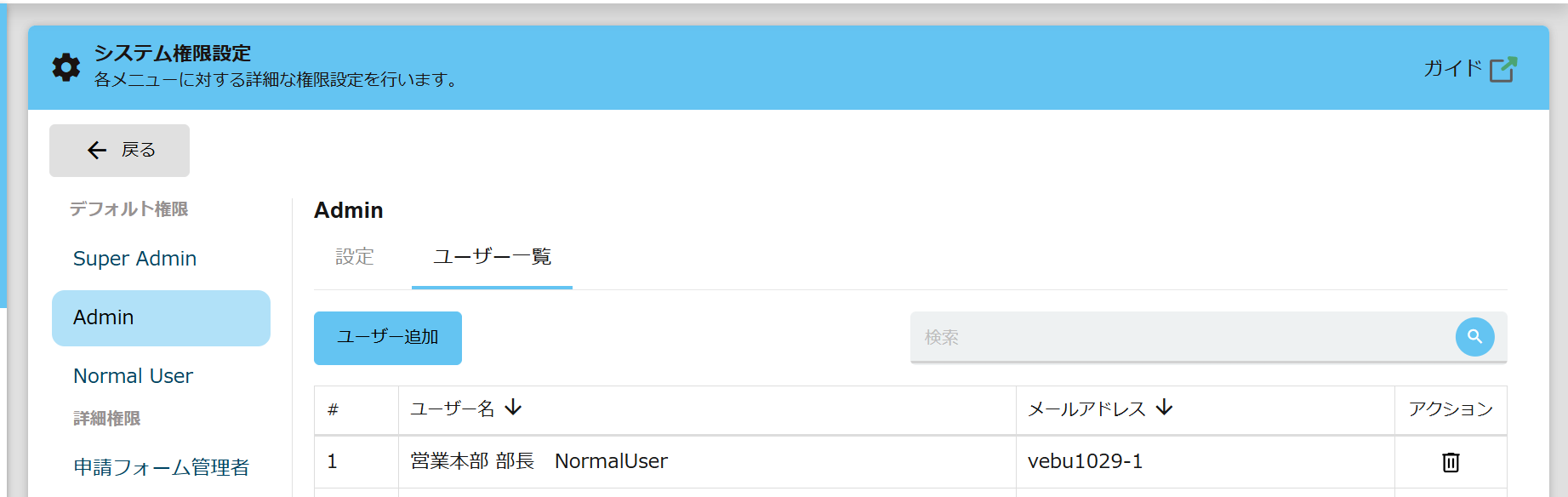 ※デフォルトの[Super Admin]・[Admin]・[Normal User]の3つの権限は、この画面で権限内容を編集することはできません。(ユーザーの割り当てのみ可能です)