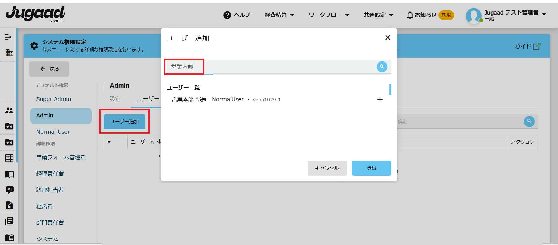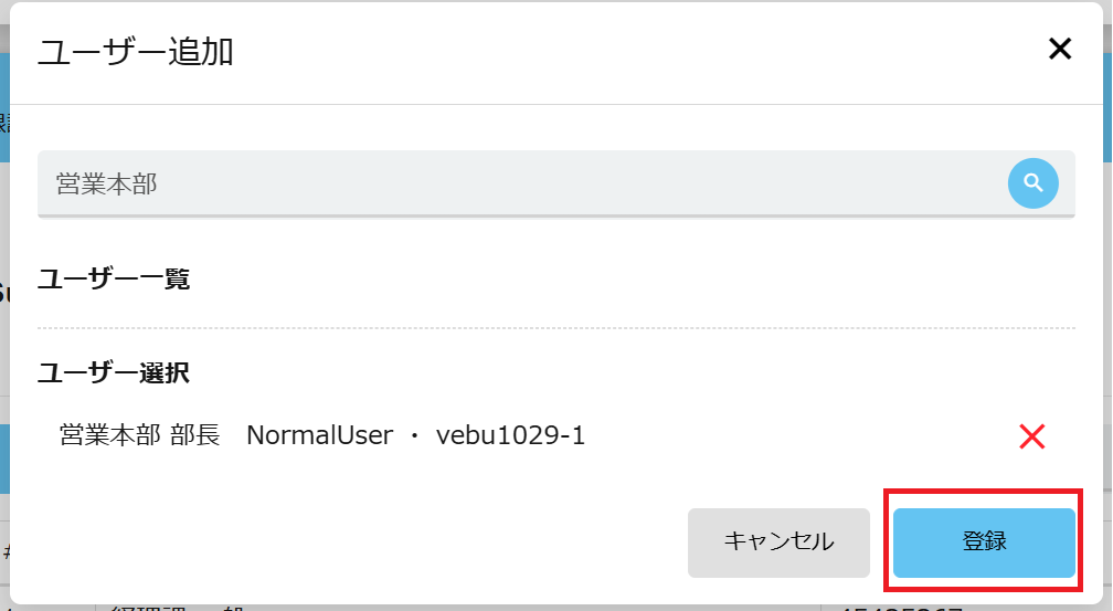 4. 権限を付与するユーザーを[+]選択し、[登録]をクリックします。