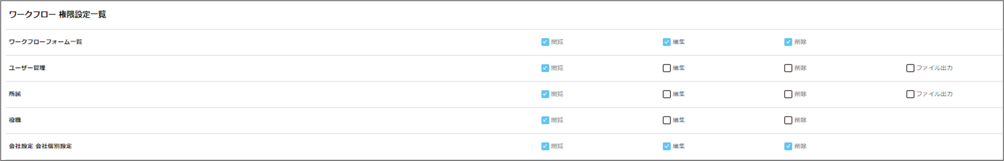 4. 各項目(例:ユーザー管理、フォーム設定)に対して、「閲覧」「編集」「削除」「ファイル出力」の権限をチェックボックスで設定します。