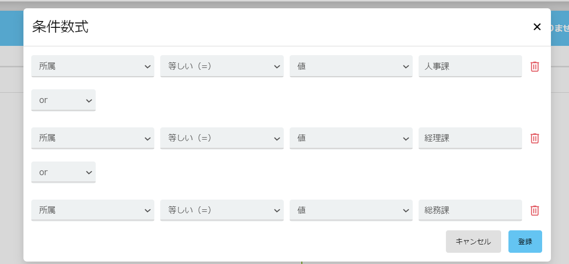 ラジオボタンでAを選択、もしくは、所属がBで役職がC この場合は④を使用します。