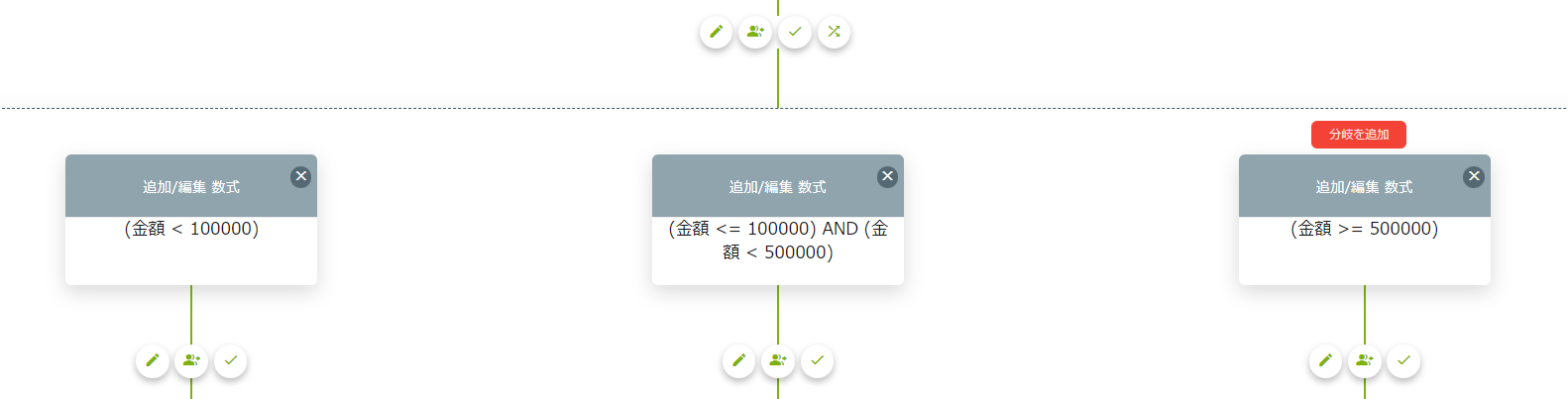 金額の範囲指定で経路を分岐させたい、金額と役職の組み合わせ、ラジオボタンと所属の組み合わせなどの条件で分岐させたい、というような場合に便利です。