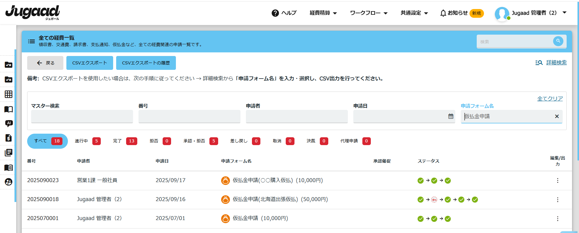 「仮払金申請」については、申請フォームの雛形が別管理のため、絞り込みで出力可能です。