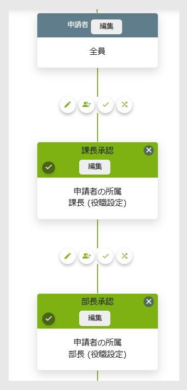 - 承認者の設定:特定のユーザーや、「課長」「部長」などの役職で承認者を指定できます。