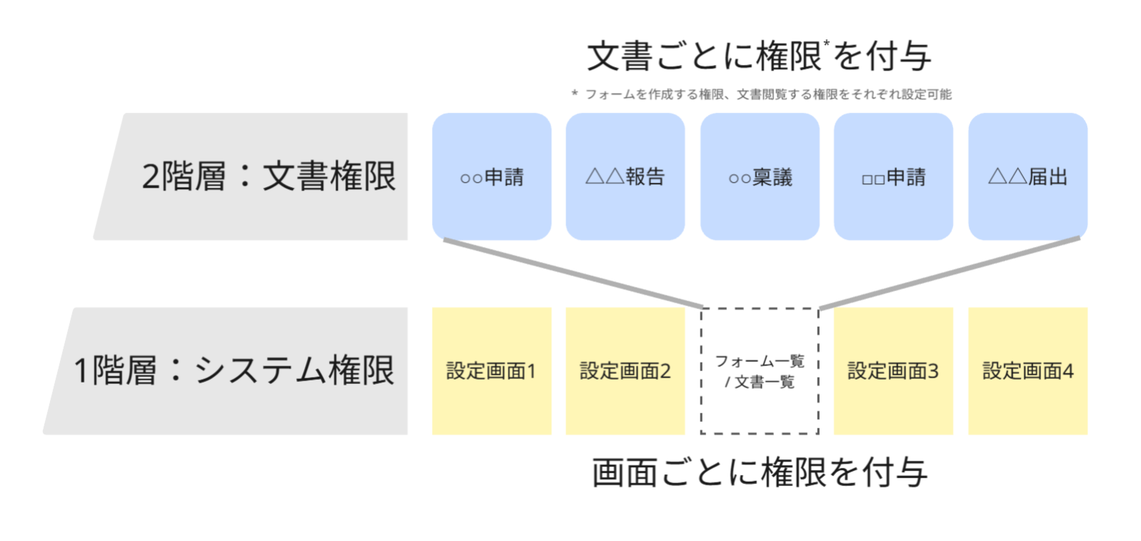 この目的を達成するため、Jugaadの権限管理は、従来の①「システム権限」(画面ごとのアクセス権限)と、文書管理機能で新設された②「文書権限」(フォームごとのアクセス権限)という2つの階層で構成されています。