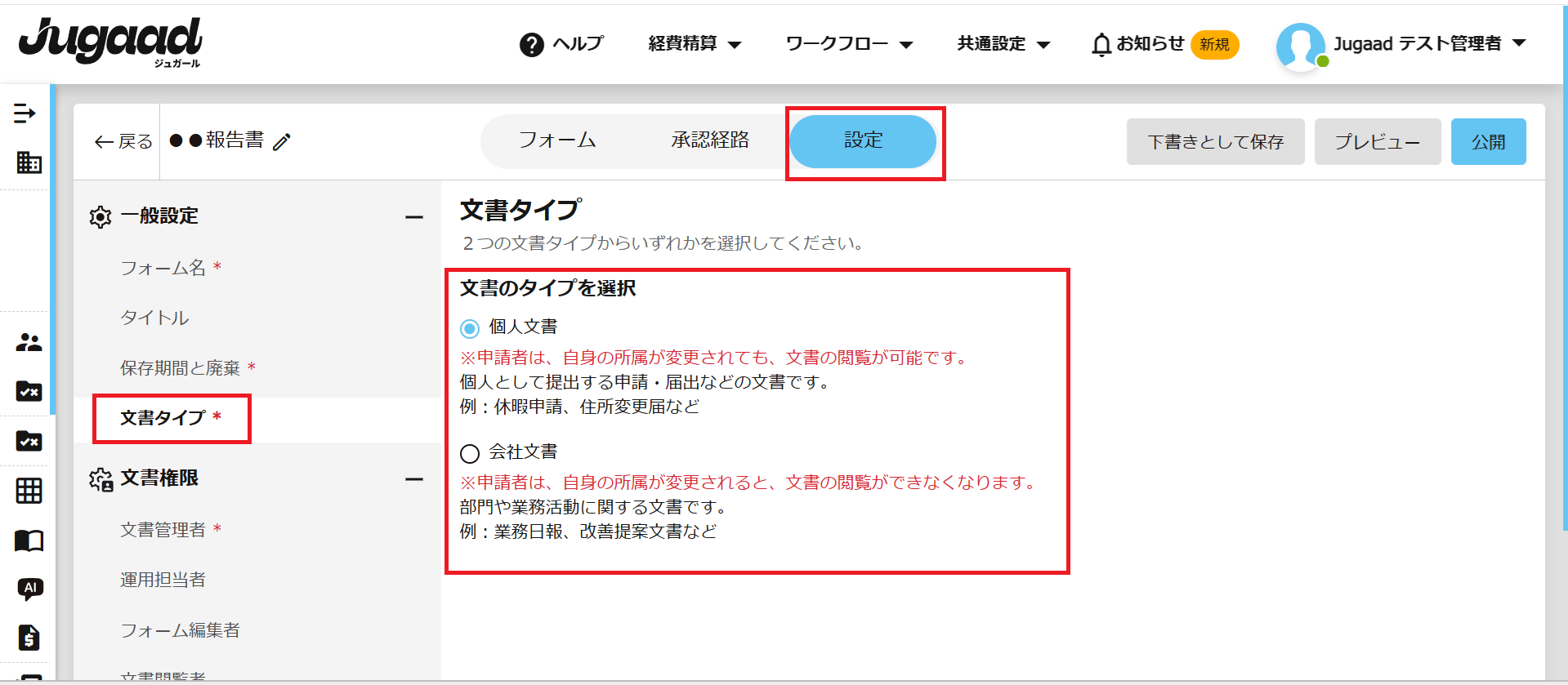 文書タイプは、申請フォームの作成時、または既存フォームの設定画面から変更できます。