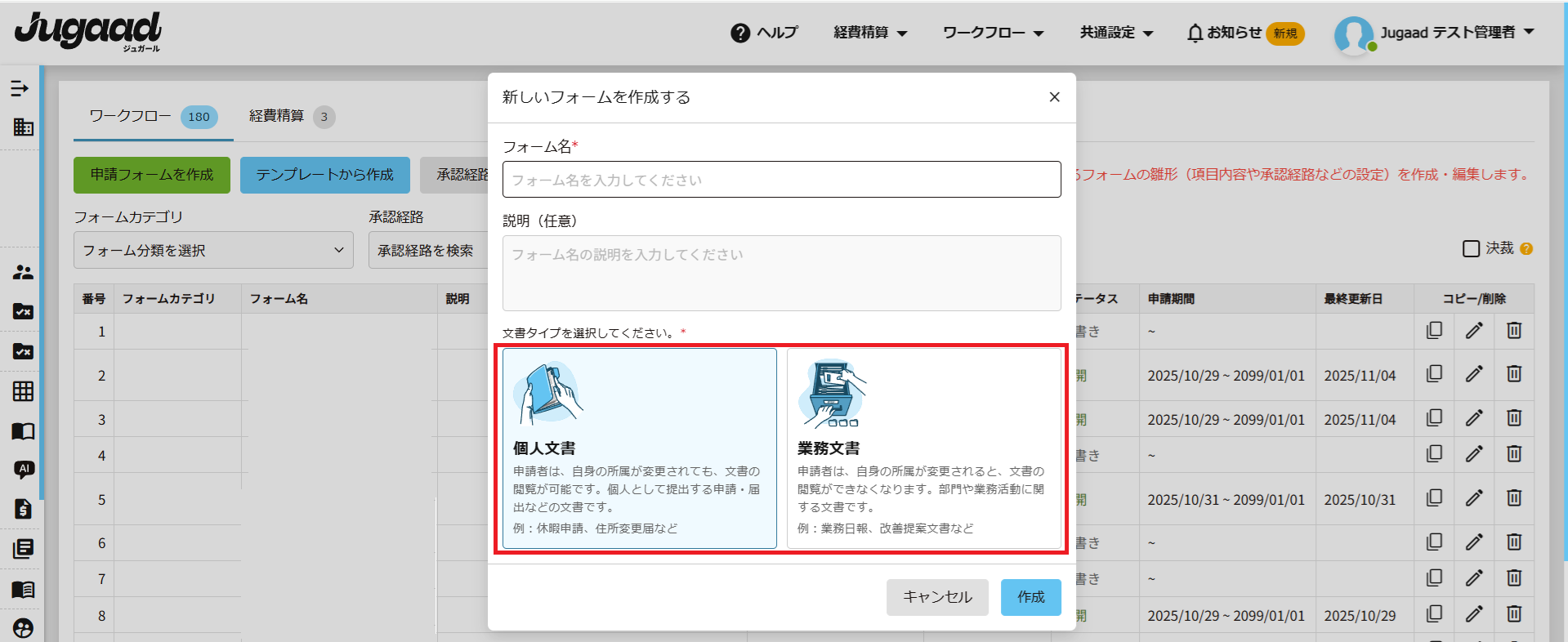 新規で申請フォームを作成する際、[文書タイプ]の項目で[個人文書]または[業務文書]を選択します。