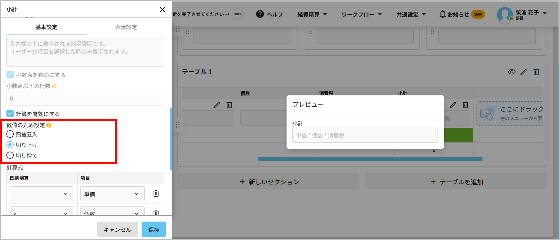 数値の計算において、小数点以下の扱いを、「四捨五入」「切り上げ」「切り捨て」から選択できるようになります。