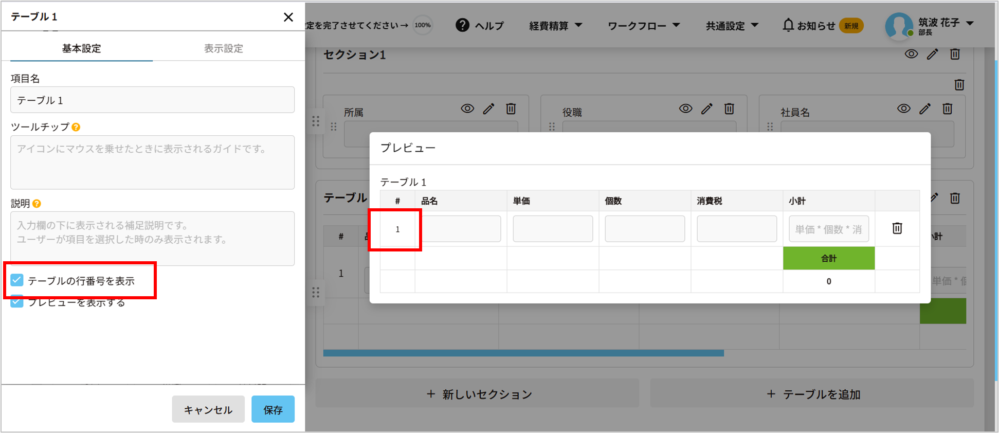 テーブルの行数が分かるように、テーブルの左側に行番号を振る設定が可能になります。