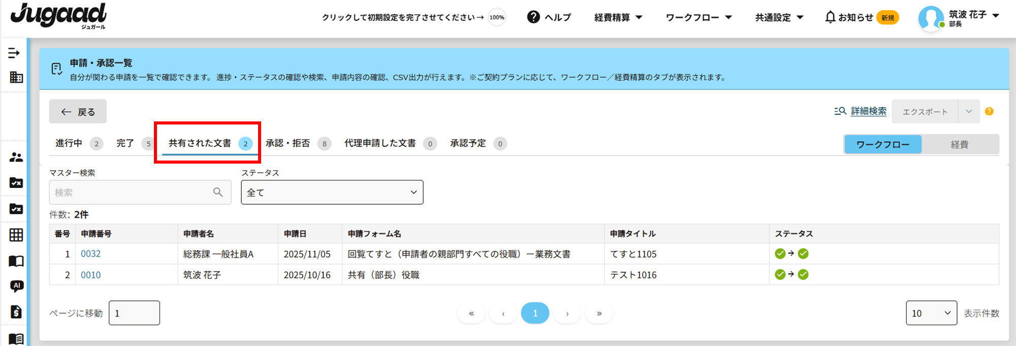 「申請・承認一覧 > 共有」で共有申請を一元管理
