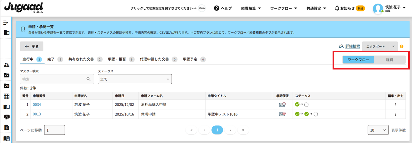 右側のタブで、「ワークフロー」「経費精算」の切り替えが可能です。