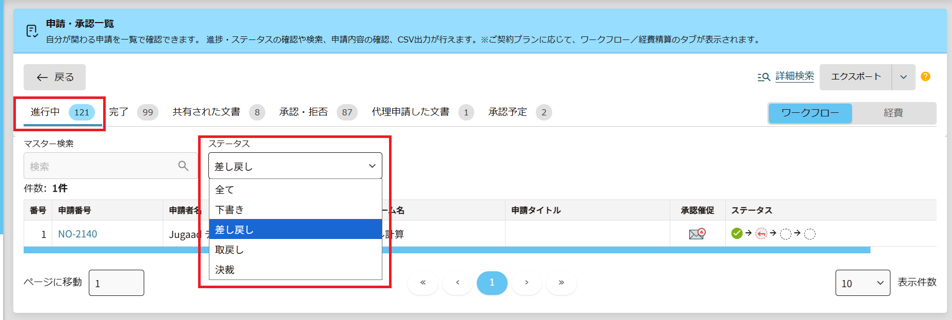 ※2025年12月23日現在、「進行中」のカテゴリのステータス「取戻し」については、メンテナンスのため、表示を一時的に非表示にしております。取り戻した申請は、「全て」の中から確認をお願いします。