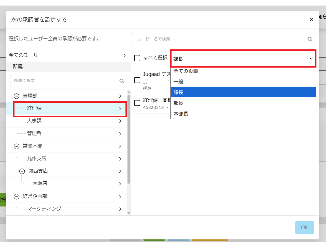 指定するユーザーは、「所属」「役職」「ユーザー名」での検索が可能です。