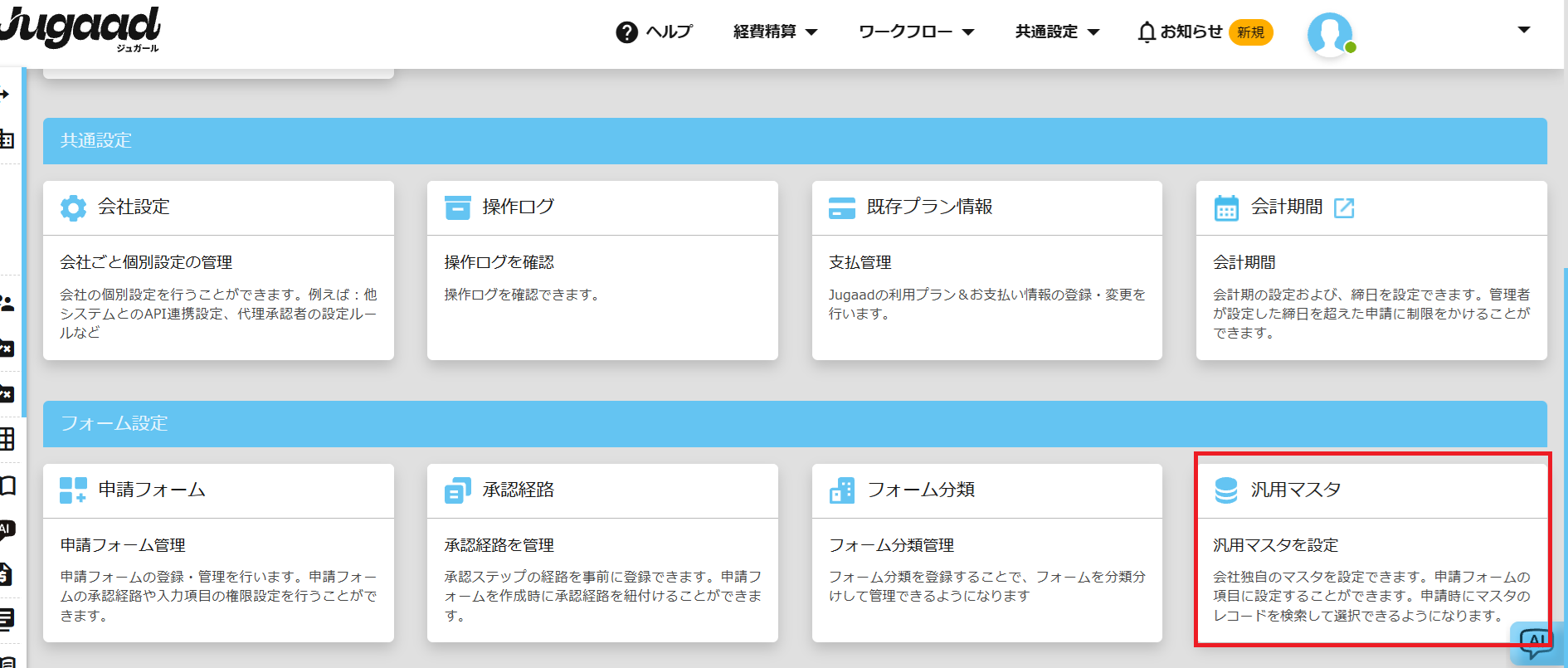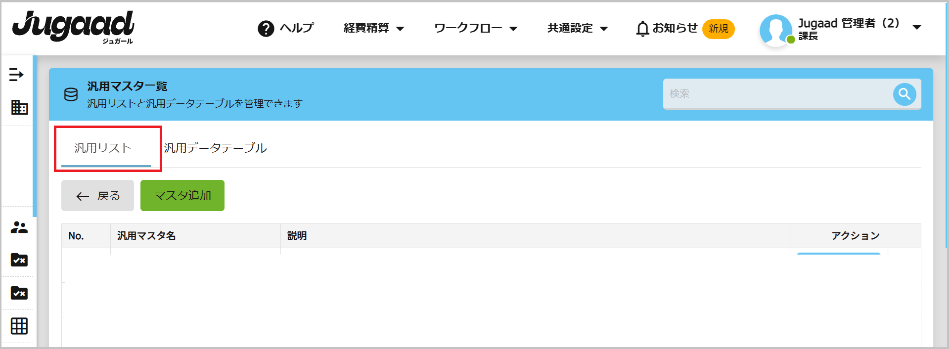 2.「汎用リスト」のタブを選択し、マスタ追加を押します