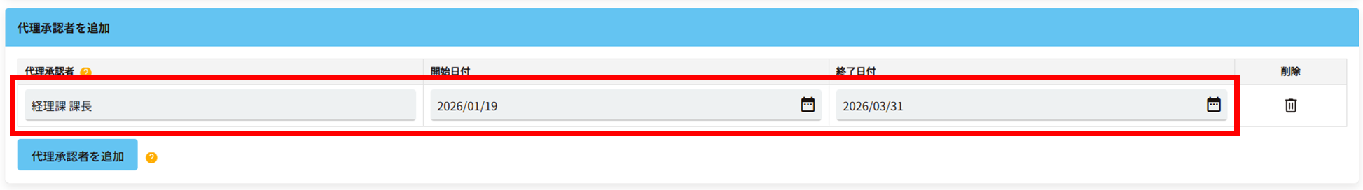 2. 「代理承認者」の項目にある入力欄に、代理承認者に設定したいユーザー名を入力し、候補から選択します。