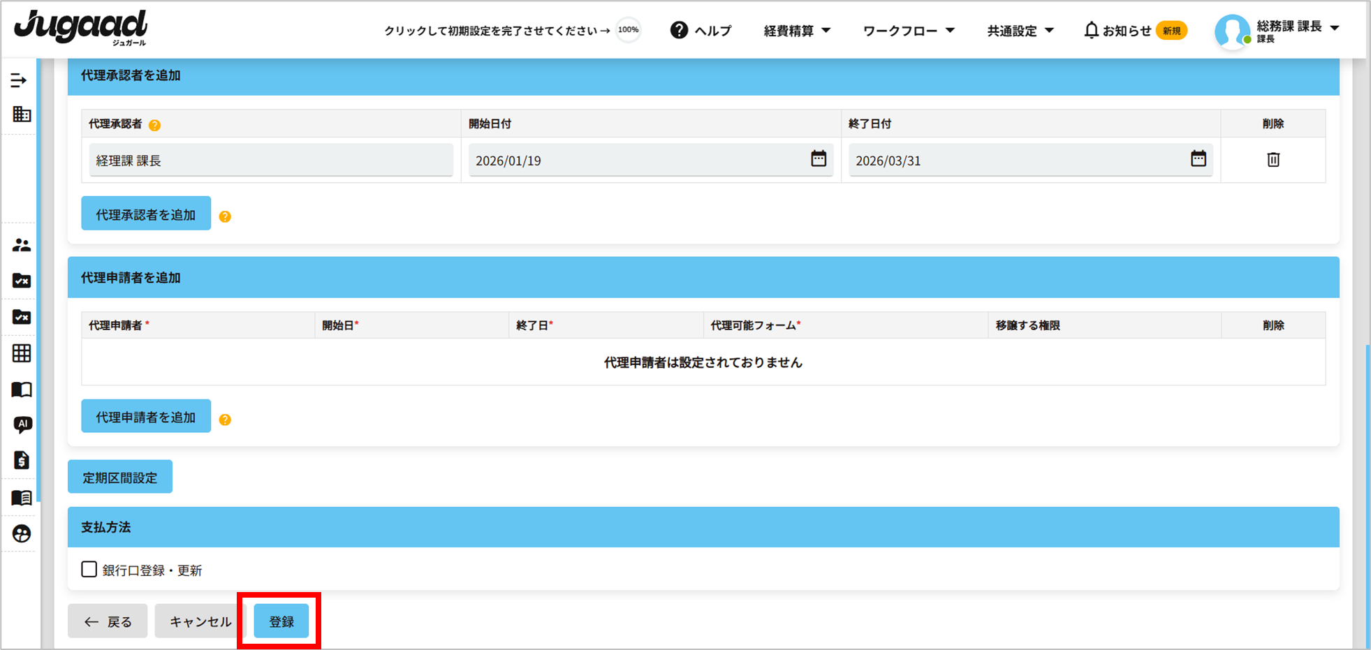 ※開始日時と終了日時を設定しない場合、変更しない限り永続的に代理承認の権限が付与されます。