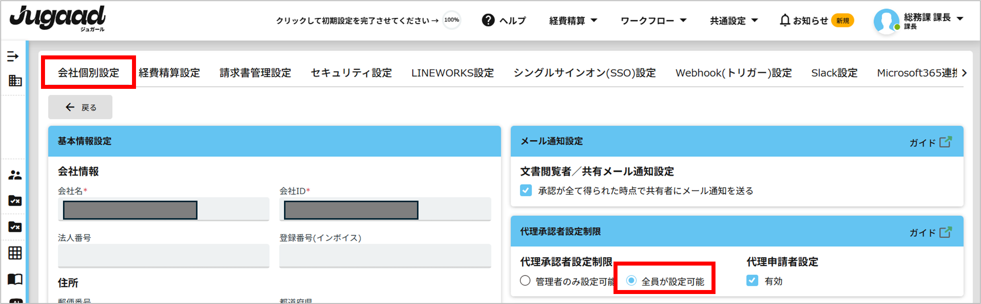 2. 「会社個別設定」タブの「代理承認者設定制限」の項目で、[全員が設定可能]を選択します。