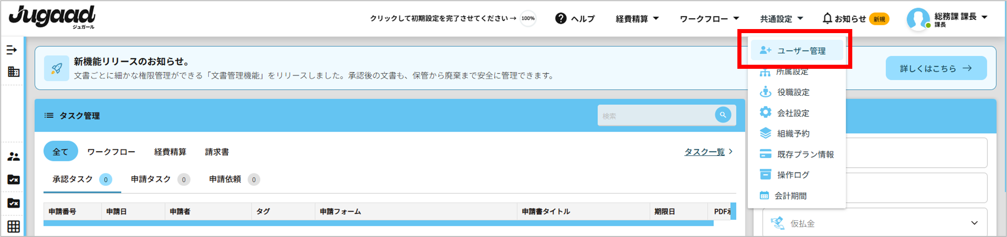 1. [共通設定]メニューにある[ユーザー管理]を押します。