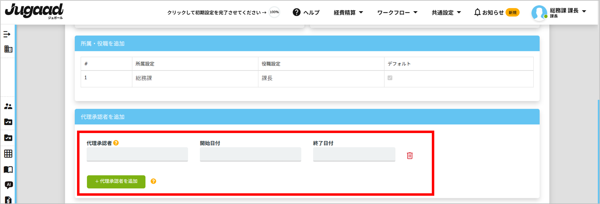 3. ユーザー詳細画面にある「代理承認者」の項目で、[代理承認者を追加]を押します。
