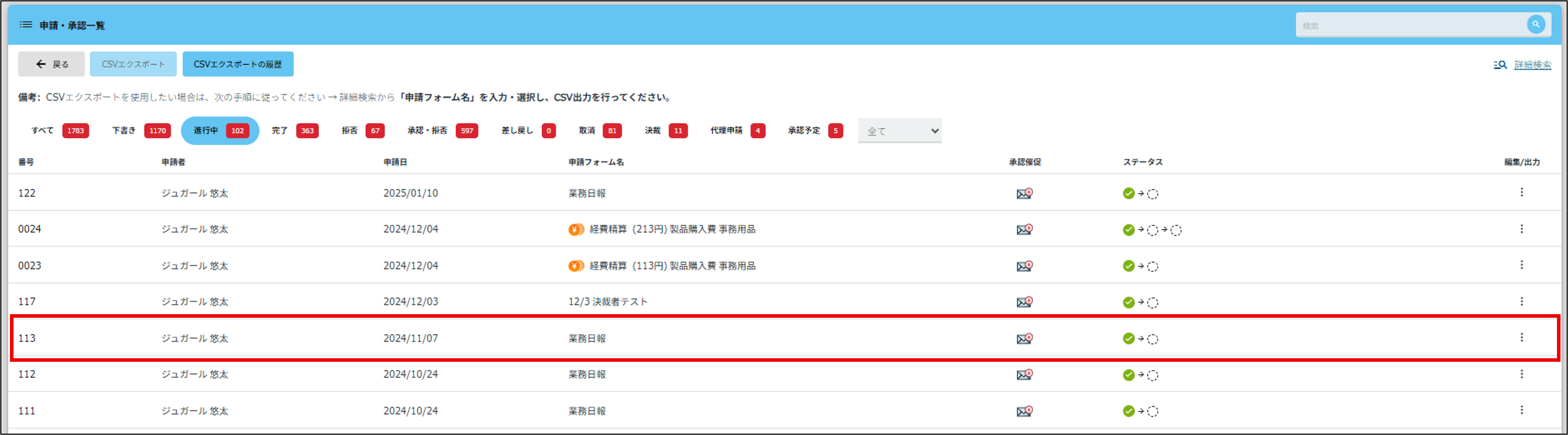 ダッシュボード申請・承認一覧の「進行中」をクリックします。