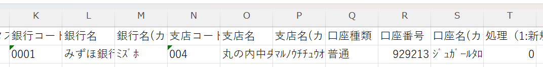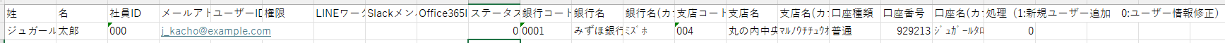 銀行コード、銀行名、銀行名(半角カナ)、支店コード、支店名、支店名(半角カナ)、口座種類、口座番号、口座名(半角カナ)、処理の入力を行ってください。(処理の項目は、既存ユーザーの情報更新のため、0を入力してください)