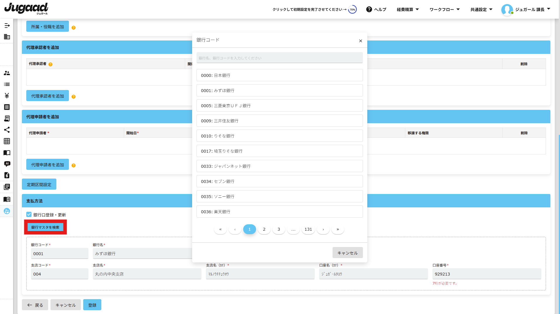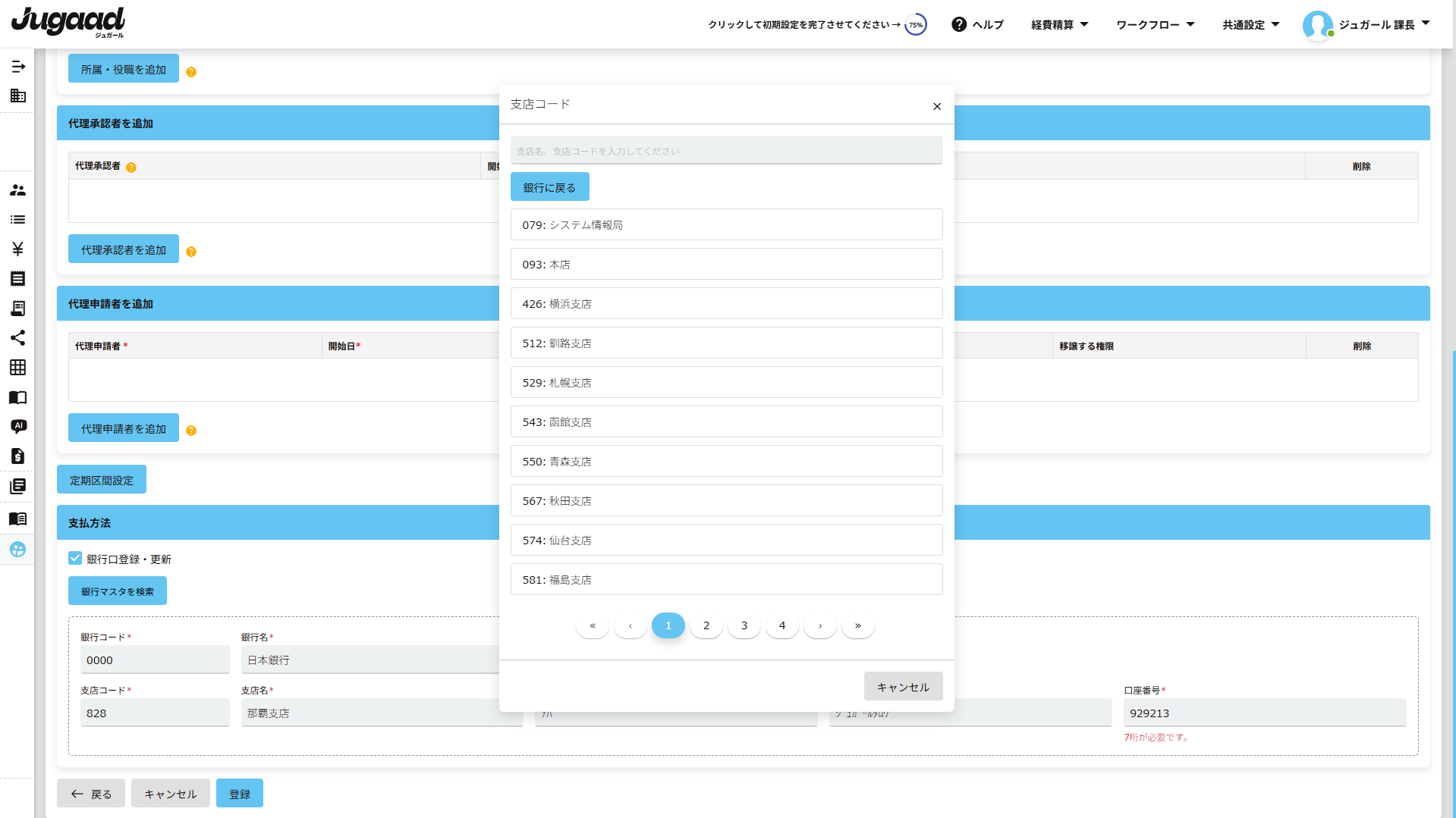 7. 候補に表示される支店をクリックして、必須項目を入力後に普通預金もしくは当座預金を選択後、「登録」をクリックします