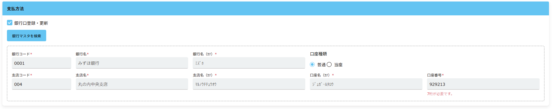 8. 必須項目を入力後に普通預金もしくは当座預金を選択後、「登録」をクリックします