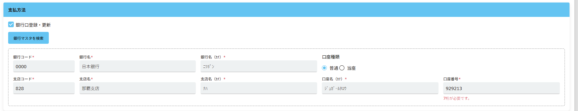 *コードは、頭文字の0を反映させる必要のがある銀行コードが多い為、文字列で入力してください