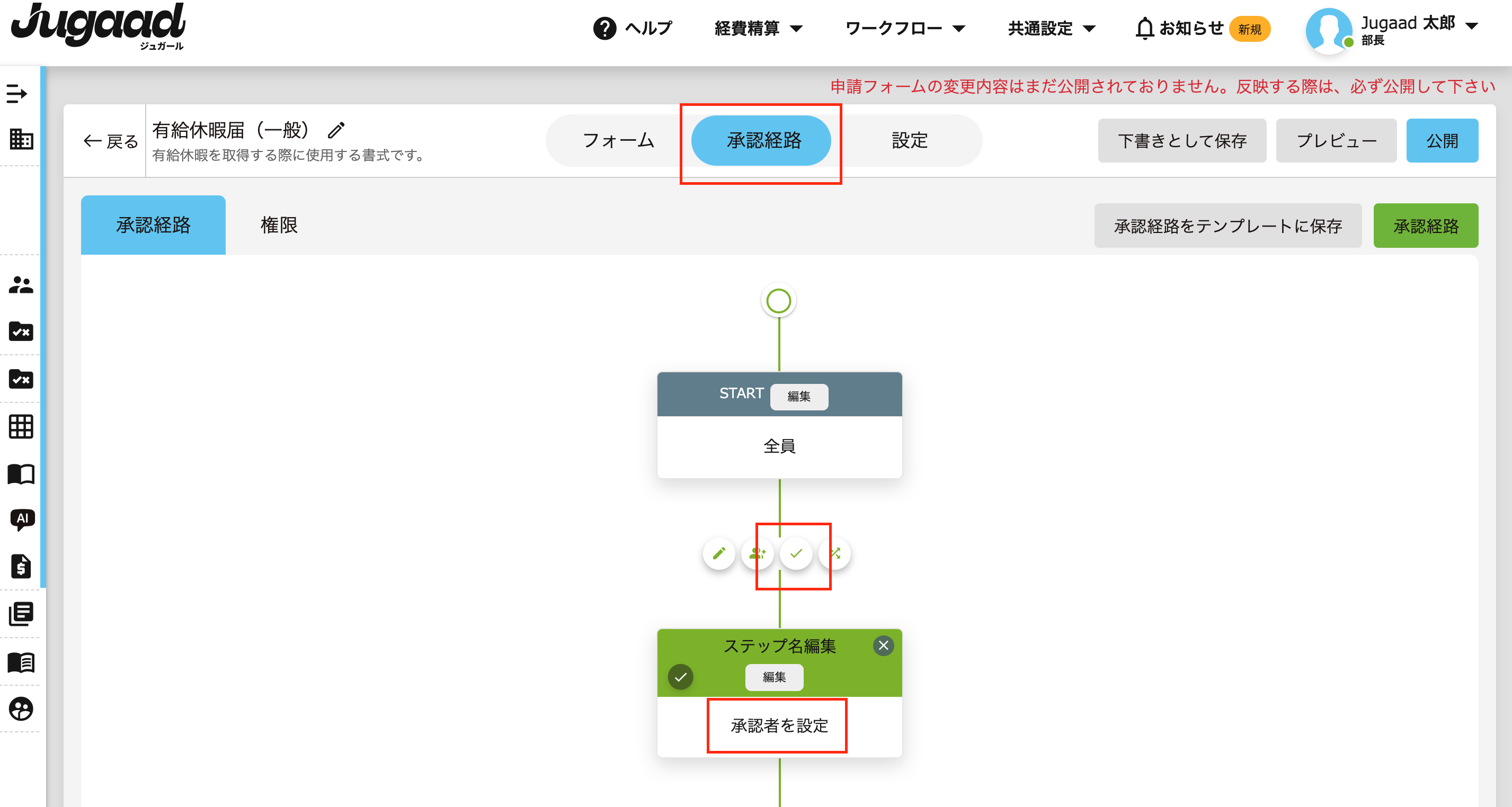 管理画面を開き「申請フォーム」から既存の申請フォームまたは、新しい申請フォーム内の「承認経路を作成」を開きます。