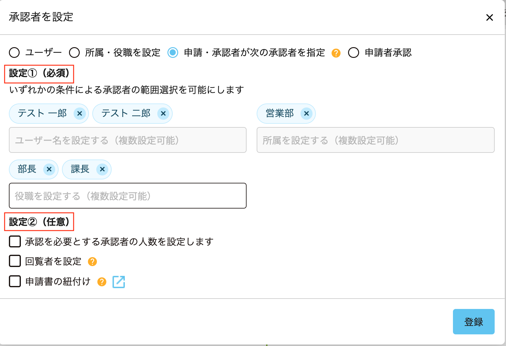 ※②の設定をしない場合は、承認者は1名のみとなります。