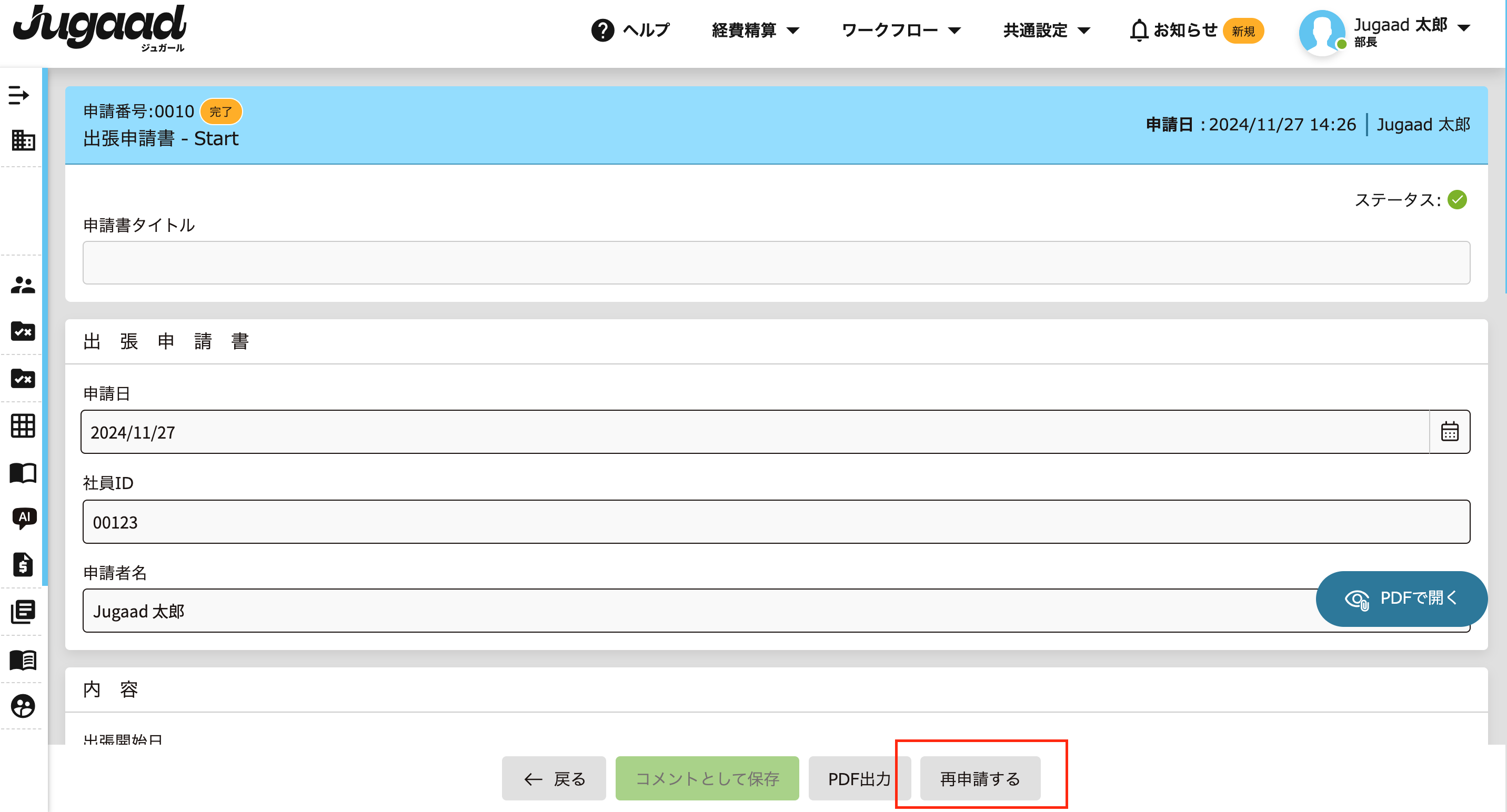 2.過去に申請をした申請書が開きますので、一番下の「再申請する」をクリックします。